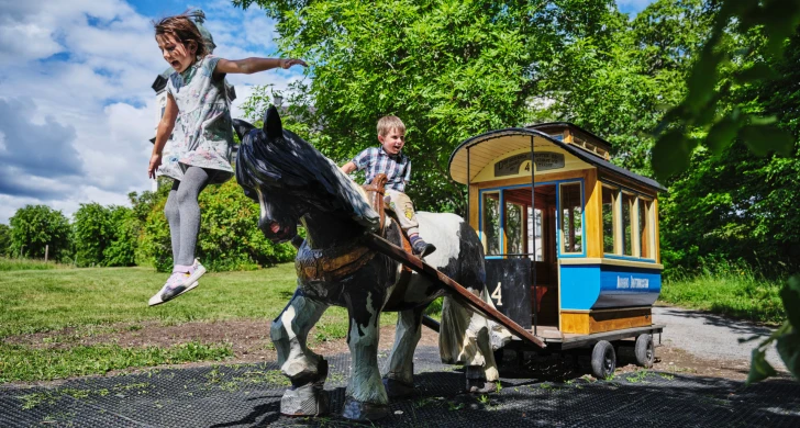 Lekpark Parkleken Paradiset Gratis 1–12 år Välkommen till Parkleken Paradiset! En ny historisk lekmiljö med stora verktyg att balansera på, lusthus och en trähäst med spårvagn klättra på. Skoklosters slott