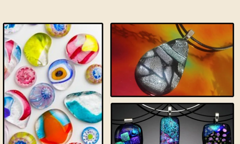 Du får sedan skapa 3 glassmycken: örhängen, halsband, ring, nyckelring brosch eller armband. Det finns vackra opaka, transparanta och dikroiska glasbitar. Du använder tänger och glaskärare för att bygga dina smycken. Glasbitarna limmas samman och du får välja ut vilka smyckesdelar du vill ska fästas på dina projekt efter bränningen.