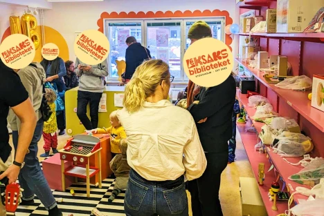 Vi har en lösning: pussel, köksredskap och bilar som går att låna. Istället för 536 leksaker per barn (genomsnitt i Sverige idag), varför inte 536 barn per leksak?