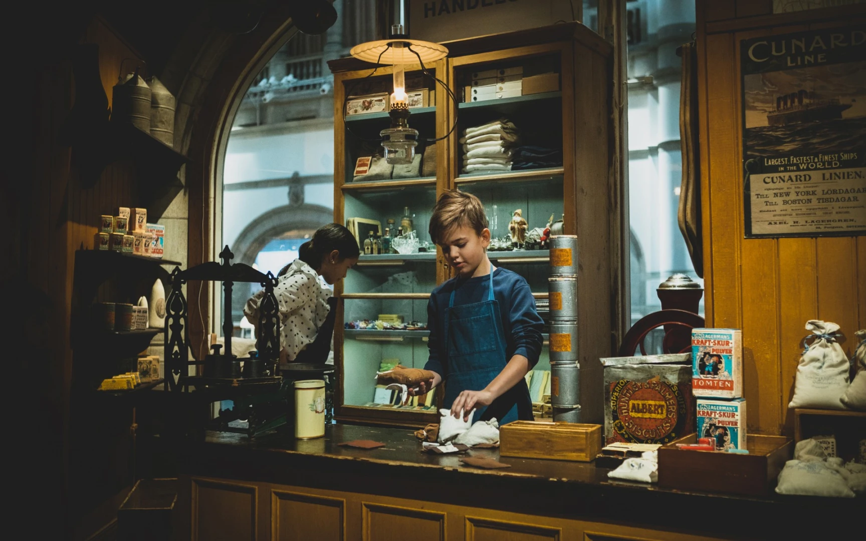 På hyllorna står socker, tvålar och smör i sina förpackningar. Du mäter, väger och paketerar och plockar ner i korgen till kunderna.