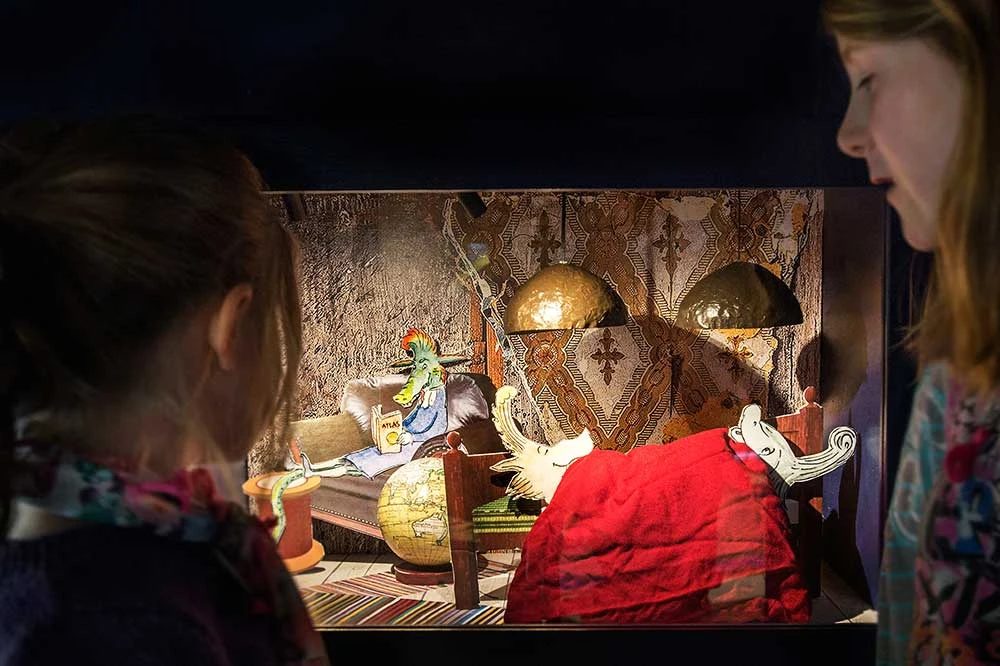 Barnspåret har formen av en dramatiserad saga som illustreras av bilder av figurerna som fanns i utställningen. Vill du lyssna på ljudspåren på din mobil eller dator, finns de att ladda ner här nedan. Sagan finns också som textversion.