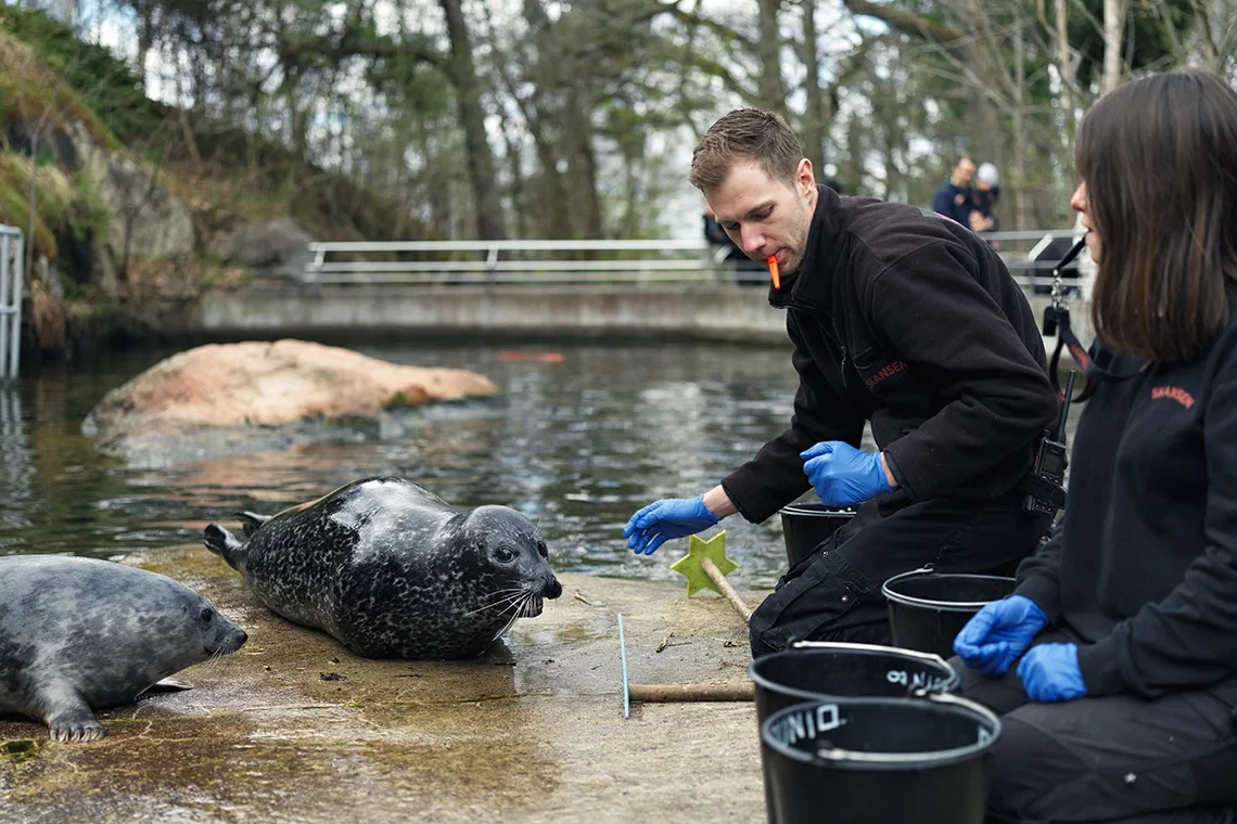 Hur kommer egentligen visselpiporna in i bilden? Djurvårdarna berättar om hur sälarna tränas på Skansen. Samtidigt får du lära dig mer om Östersjön och hållbara hav. Lyssna, lär och upplev!