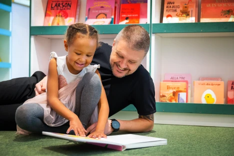 Biblioteket Rum för Barn riktar sig till åldersgruppen 0–9 år och deras vuxna. Här finns böcker på över 50 språk och mysiga platser för att läsa tillsammans. Våra bibliotekarier hjälper dig gärna med lästips eller att hitta boken du söker.