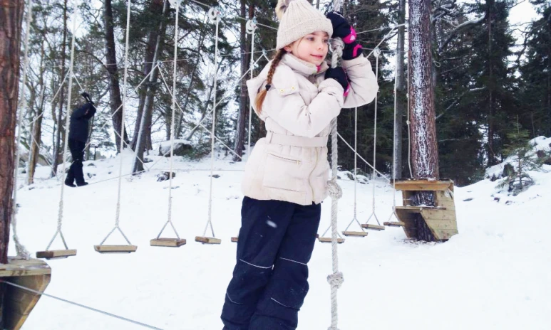 I skogen intill gårdens fotbollsgolfsbana har vi byggt en skogshinderbana med olika utmaningar där du får balansera på linor, klättra i nät, slänga dig i lianer och ta dig över vingliga stockar.
