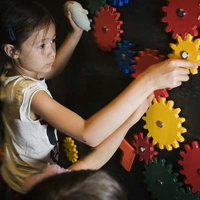Här kan man man leka och lära om mekanik, ljud, ljus och tid. Med exempelvis spännande kulbanor och färgglada kugghjul som barnen sätter samman och får att fungera, växer nyfikenheten för teknik och mekanik fram.
