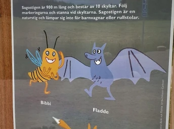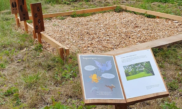 Sagostigen är cirka 800 m lång och består av tio stationer med skyltar. Följ markeringarna och stanna vid skyltarna där det finns olika uppgifter att utmana sig med. Sagostigen är en naturstig och lämpar sig inte för barnvagnar eller rullstolar.