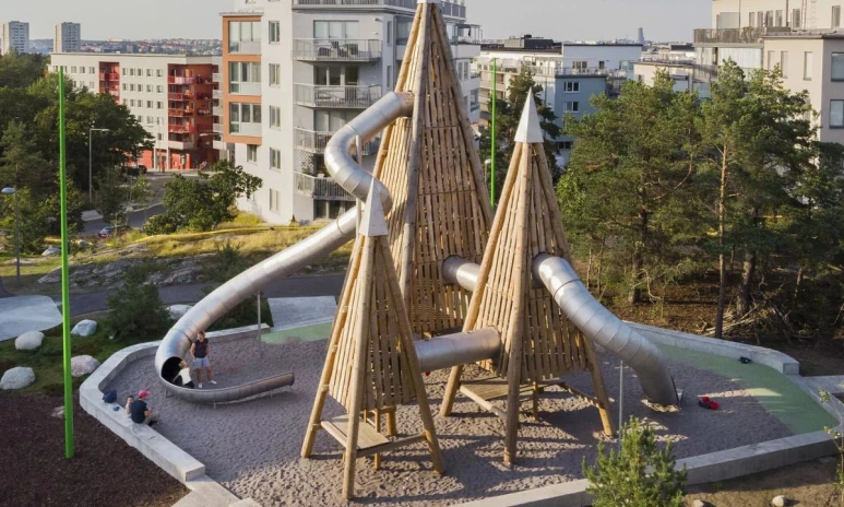 På Kråkberget i Årstaberg finns bland annat ett torn i trä med rutschkanor i olika höjder och bredder. Parken passar bäst för mer självständiga barn och den spänningssökande.