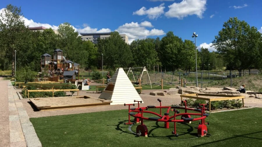 Lekplatsen har Uppsalas största klätterställning, den längsta studsmattan och det bästa sand- och geggamojalandet.
