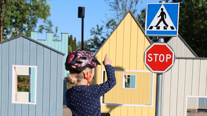 Lekplatsen är en utflyktslekplats med trafiktema och här finns aktiviteter som passar alla åldrar. Ta gärna med en egen sparkcykel eller cykel.