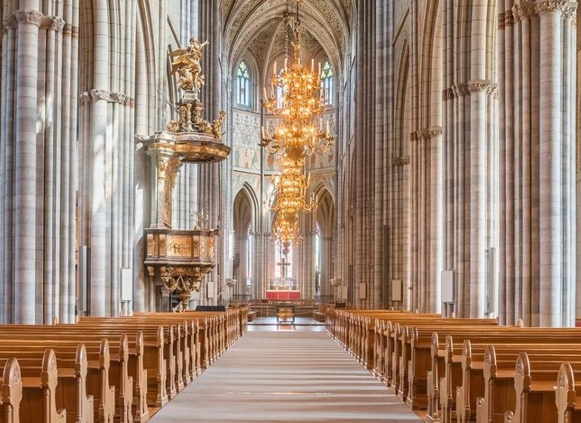Uppsala domkyrka är en stor och spännande plats full av historia. Här kan ni vandra runt i den gamla kyrkan, titta på färgglada fönster, höga valv och kanske hitta några hemliga detaljer i väggarna.