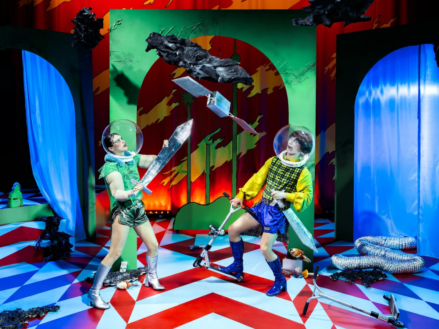 Den gröne riddaren är en föreställning för barn mellan 5–8 år och deras vuxna, om mod, löften och den stora frågan: vad är egentligen en riddares mål och mening? Publiken bjuds in i ett “lustiga huset” där klassiska riddarreferenser möter energifylld glamrock och kultförklarad sci-fi, och där barnen själva får delta för att lägga pusslet kring sagans obesvarade gåta.