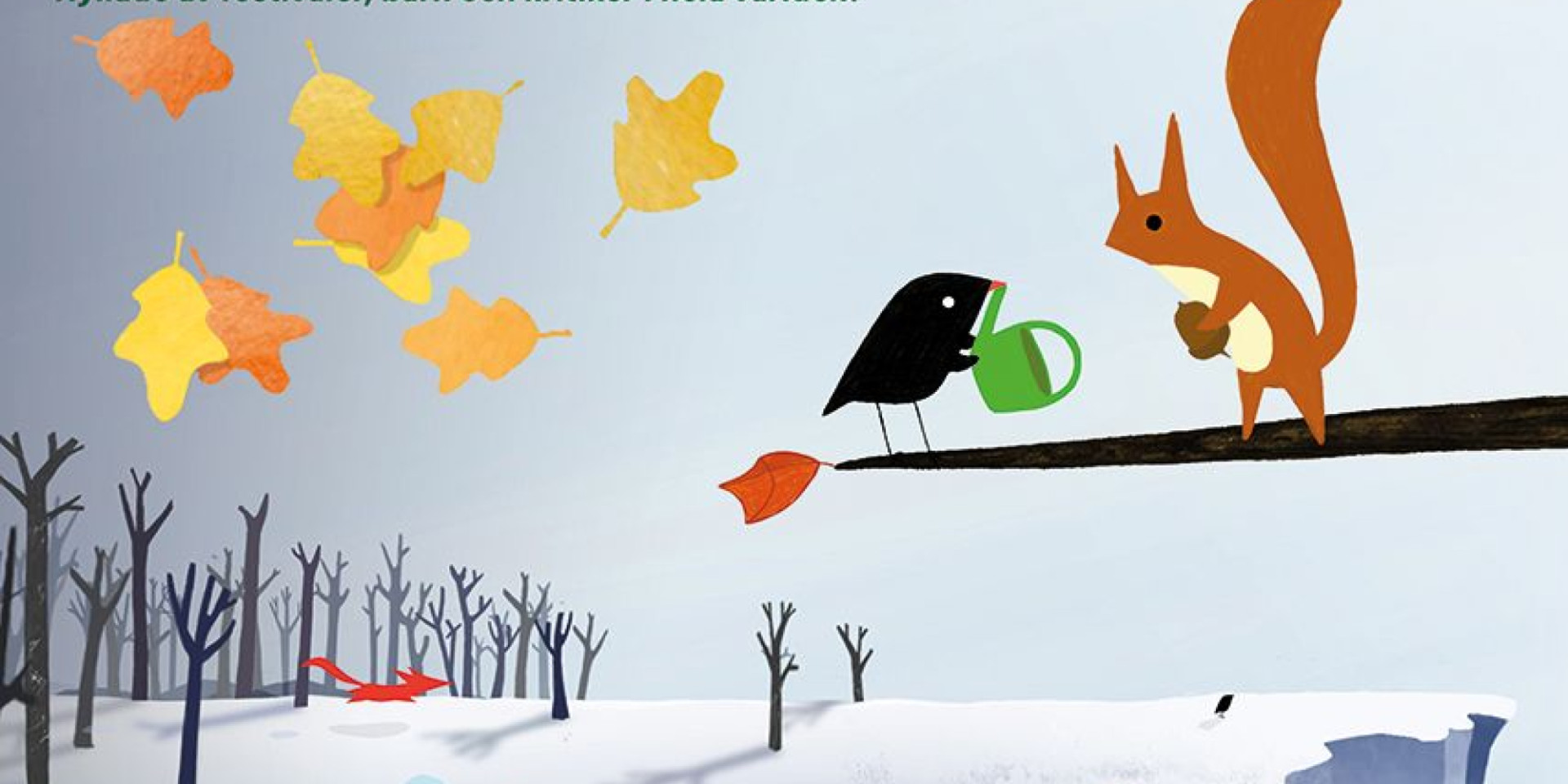 Det är höst. Högt uppe i sitt träd tar Den lilla fågeln hand om det löv som hänger kvar på grenen. Skogen har blivit gul. Då kommer en ekorre och tar Den lilla fågelns vattenkanna! Den lilla fågeln följer efter den fräcka tjuven -och hamnar så på ännu ett spännande äventyr i den föränderliga skogen…
