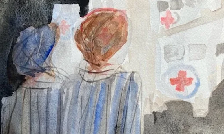 Vi börjar med att berätta om Vita bussarna genom att titta på Lena Rubinsteins Reichs akvareller tillsammans. Lena har målat sin mamma Cesias historia och hur hon kom till Sverige med Vita bussarna.