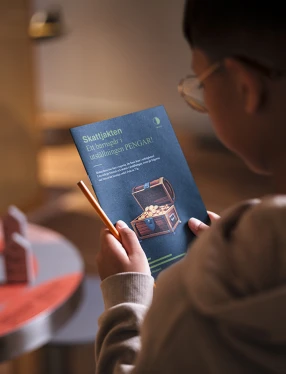På vägen får du träffa en uggla, en kung och en rad andra färgstarka figurer som ger dig ledtrådarna du behöver. Vi hoppas du ska ha kul och samtidigt lära dig lite om pengar genom historien.