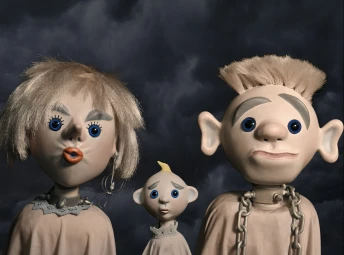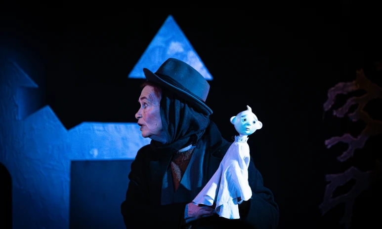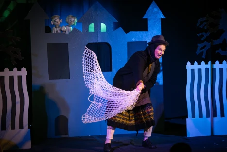 En lekfull, mysläskig föreställning med dockor, människor och musik.