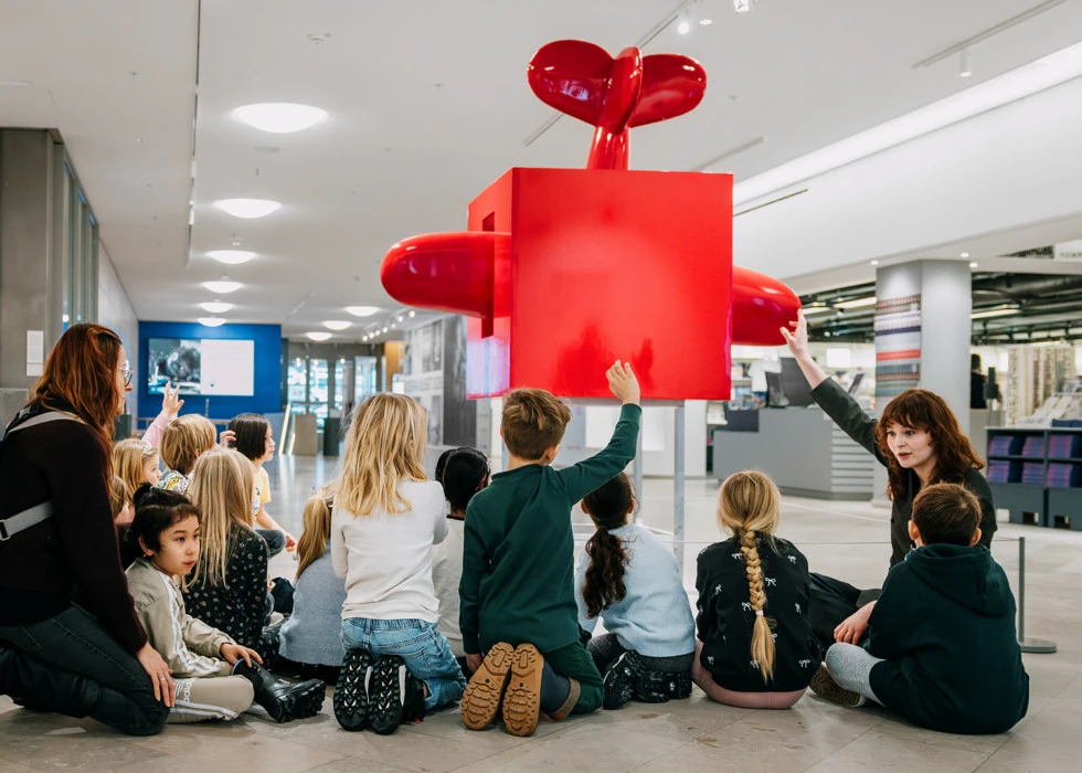 Ett flygplan och en kartong – hur hör de ihop? Truls Melins röda skulptur “Aspirant” (1989) står mitt i Moderna Museets foajé. Ett föremål för lek och fantasi, men också en symbol för funktion och nytta. Vilka tankar, frågor eller minnen väcker verket hos oss?