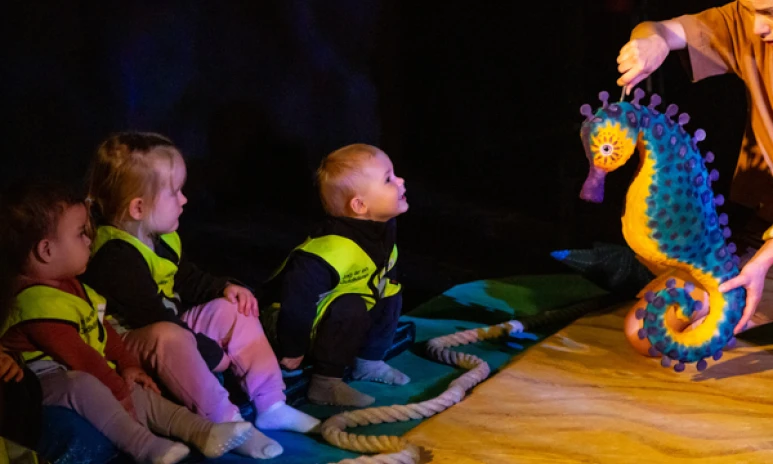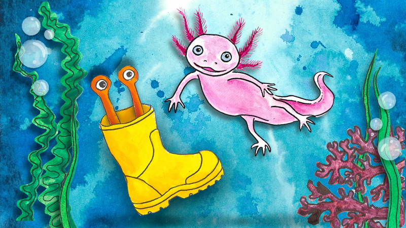 Följ med ner i en glittrande undervattensvärld där vi får möta två kära sjöhästar, sjungande fiskar och en busig axolotl. Och vad är det som kommer guppandes där? En gul stövel! Vem gömmer sig i den?